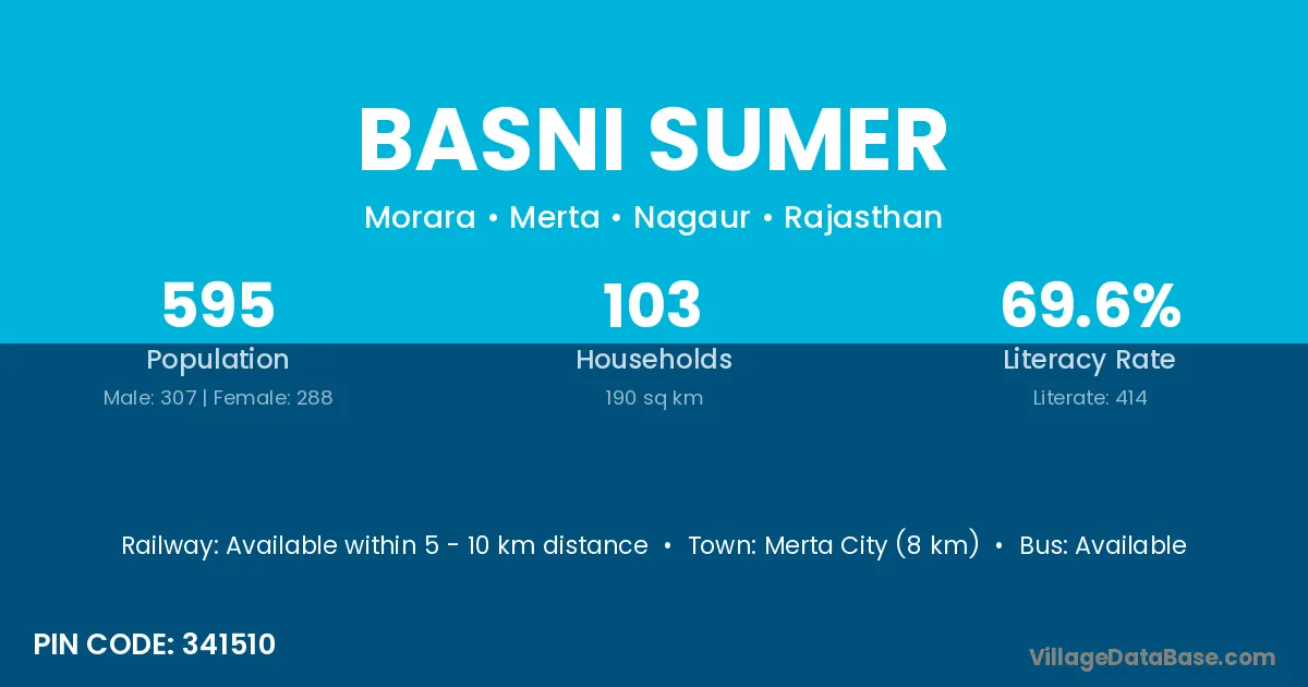 Merta City (8 km) is the nearest town to Basni Sumer village for major economic activities and is located approximately 8 km away.