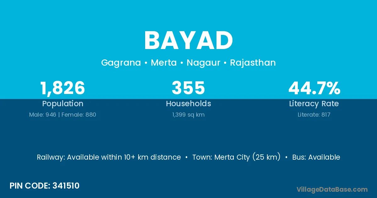 Merta City (25 km) is the nearest town to Bayad village for major economic activities and is located approximately 25 km away.