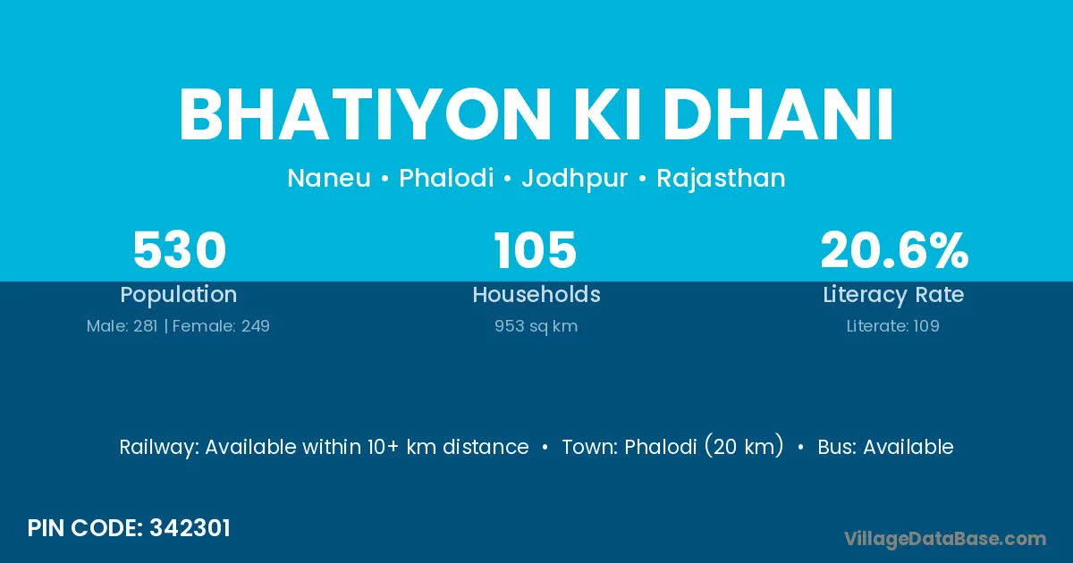 The literacy rate of Bhatiyon Ki Dhani village is 55.67%. Male literacy stands at 66.10% and female literacy at 43.83%.