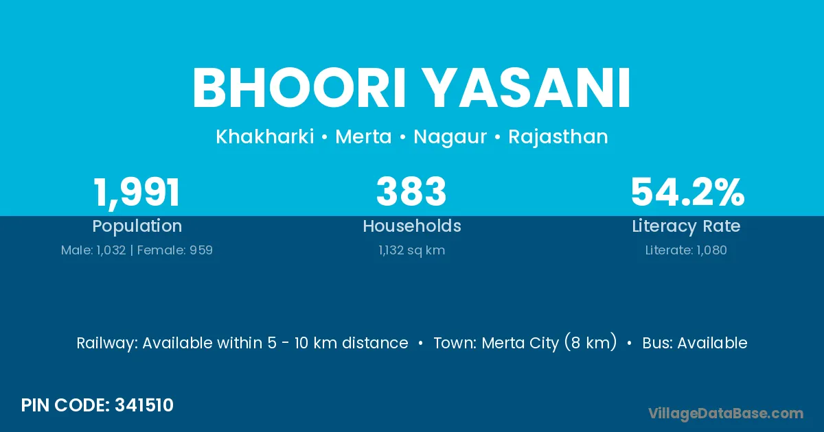Merta City (8 km) is the nearest town to Bhoori Yasani village for major economic activities and is located approximately 8 km away.