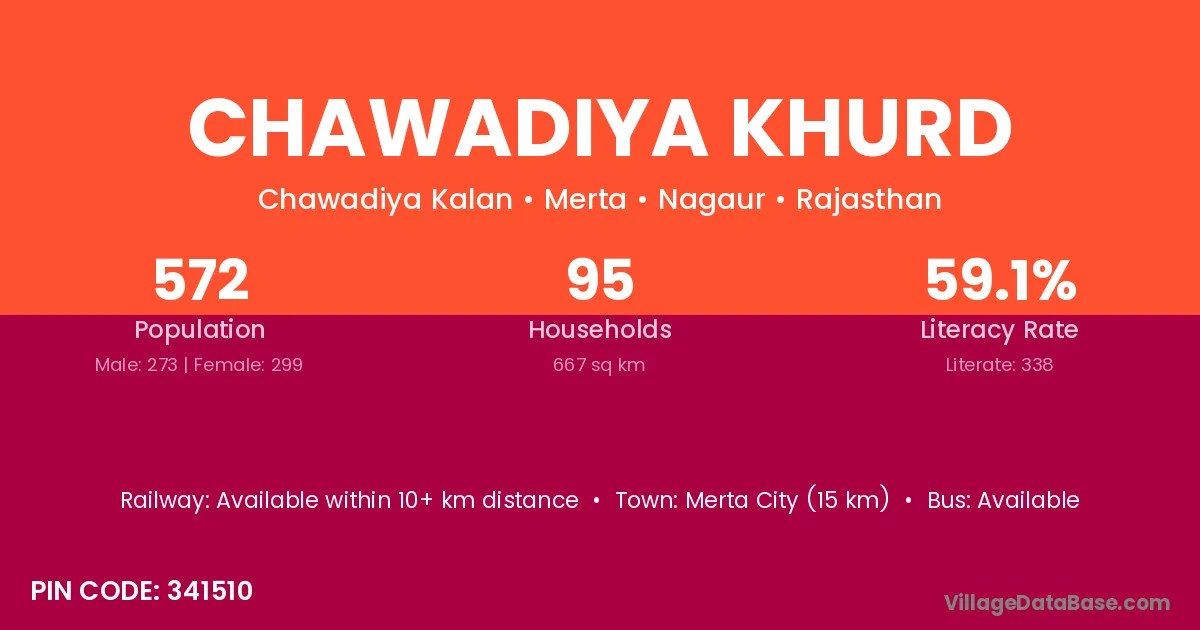 Merta City (15 km) is the nearest town to Chawadiya Khurd village for major economic activities and is located approximately 15 km away.