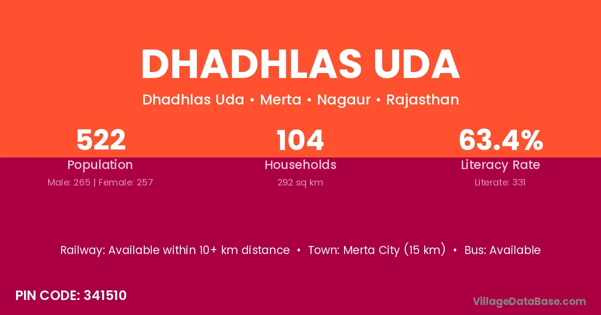 Merta City (15 km) is the nearest town to Dhadhlas Uda village for major economic activities and is located approximately 15 km away.