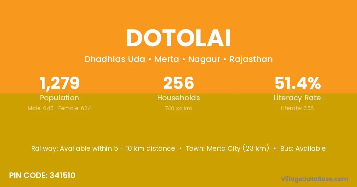 Merta City (23 km) is the nearest town to Dotolai village for major economic activities and is located approximately 23 km away.