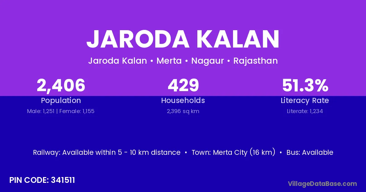 Merta City (16 km) is the nearest town to Jaroda Kalan village for major economic activities and is located approximately 16 km away.