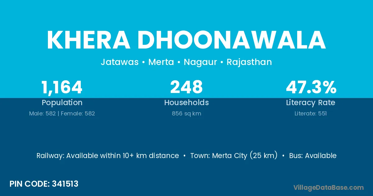 Merta City (25 km) is the nearest town to Khera Dhoonawala village for major economic activities and is located approximately 25 km away.