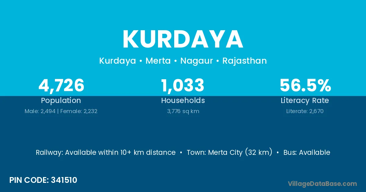 Merta City (32 km) is the nearest town to Kurdaya village for major economic activities and is located approximately 32 km away.