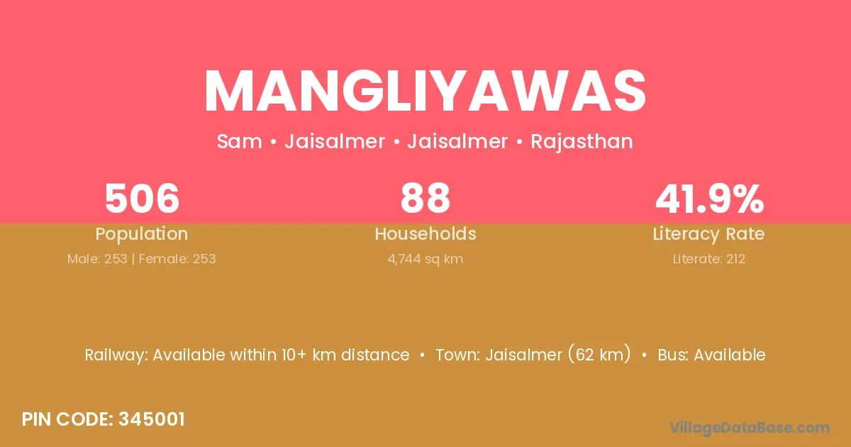 The literacy rate of Mangliyawas village is 45.41%. Male literacy stands at 56.54% and female literacy at 34.00%.