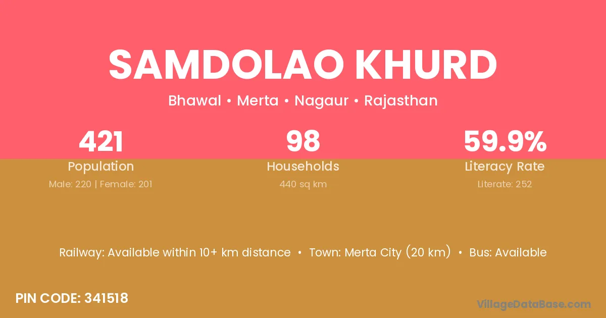 Merta City (20 km) is the nearest town to Samdolao Khurd village for major economic activities and is located approximately 20 km away.