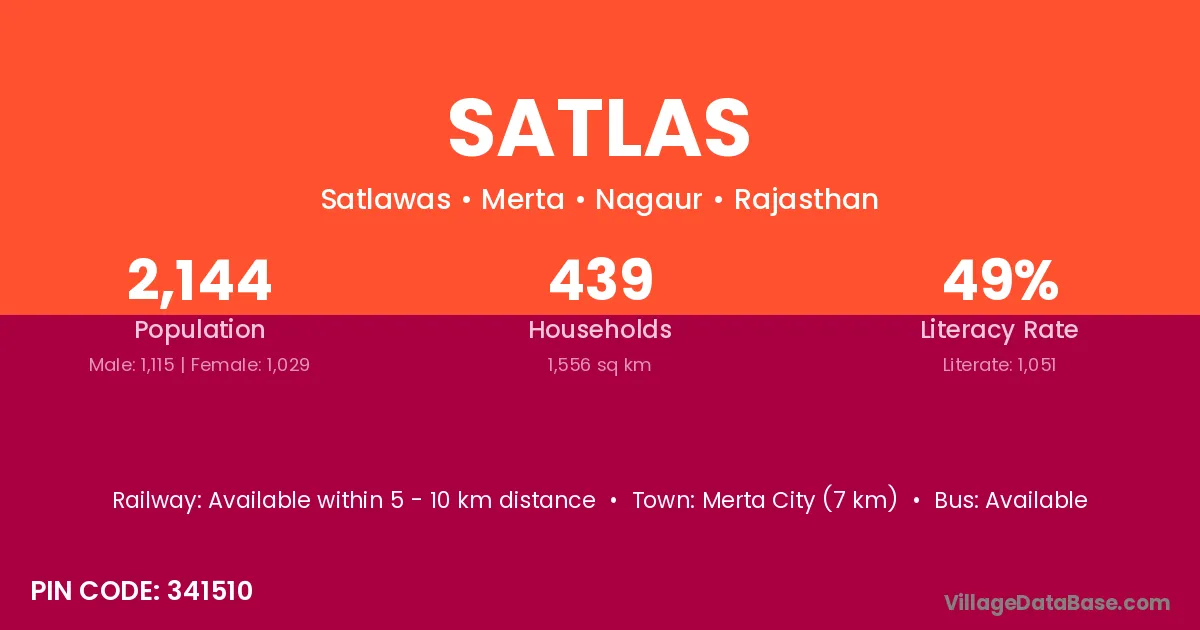 Merta City (7 km) is the nearest town to Satlas village for major economic activities and is located approximately 7 km away.