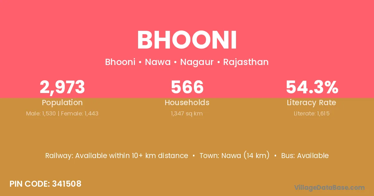 Nawa (14 km) is the nearest town to Bhooni village for major economic activities and is located approximately 14 km away.