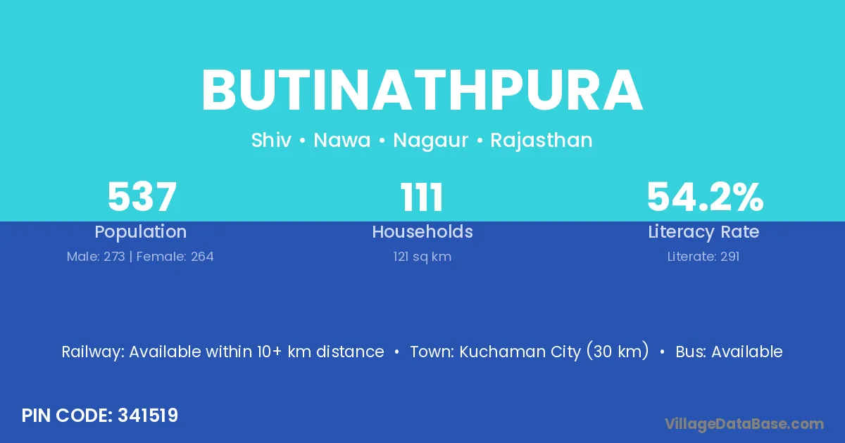 Kuchaman City (30 km) is the nearest town to Butinathpura village for major economic activities and is located approximately 30 km away.