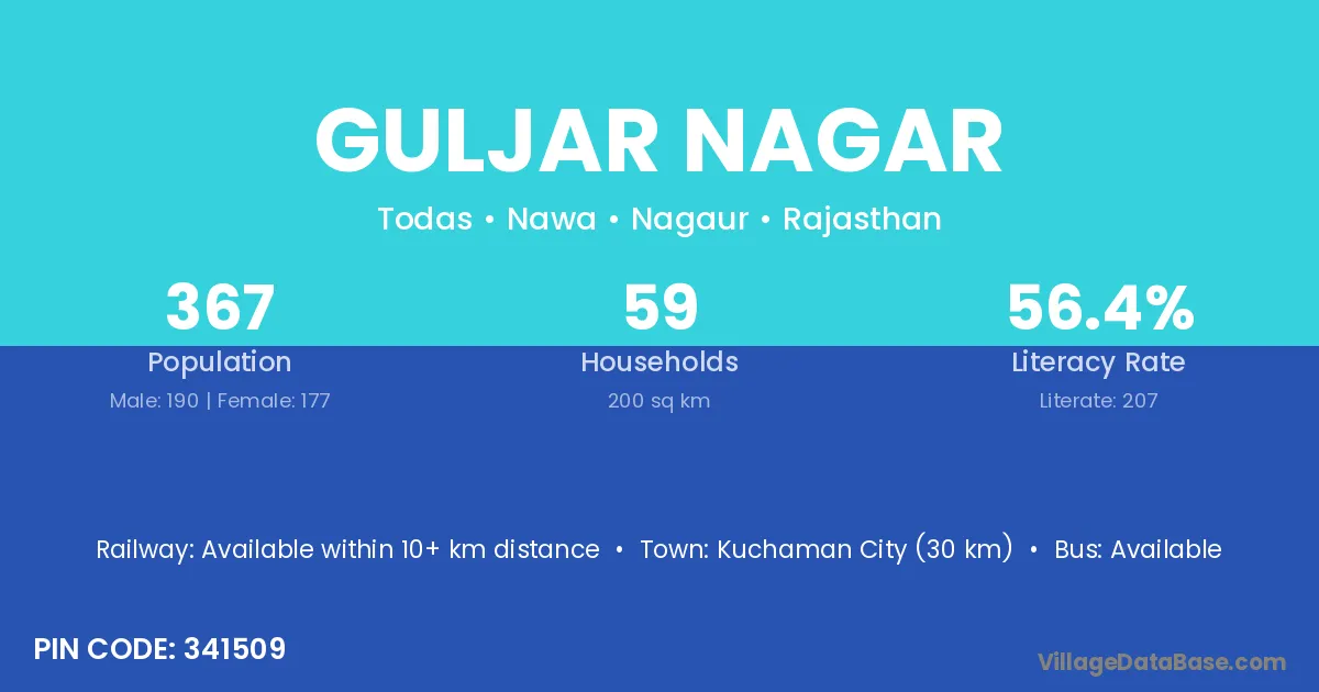 Kuchaman City (30 km) is the nearest town to Guljar Nagar village for major economic activities and is located approximately 30 km away.