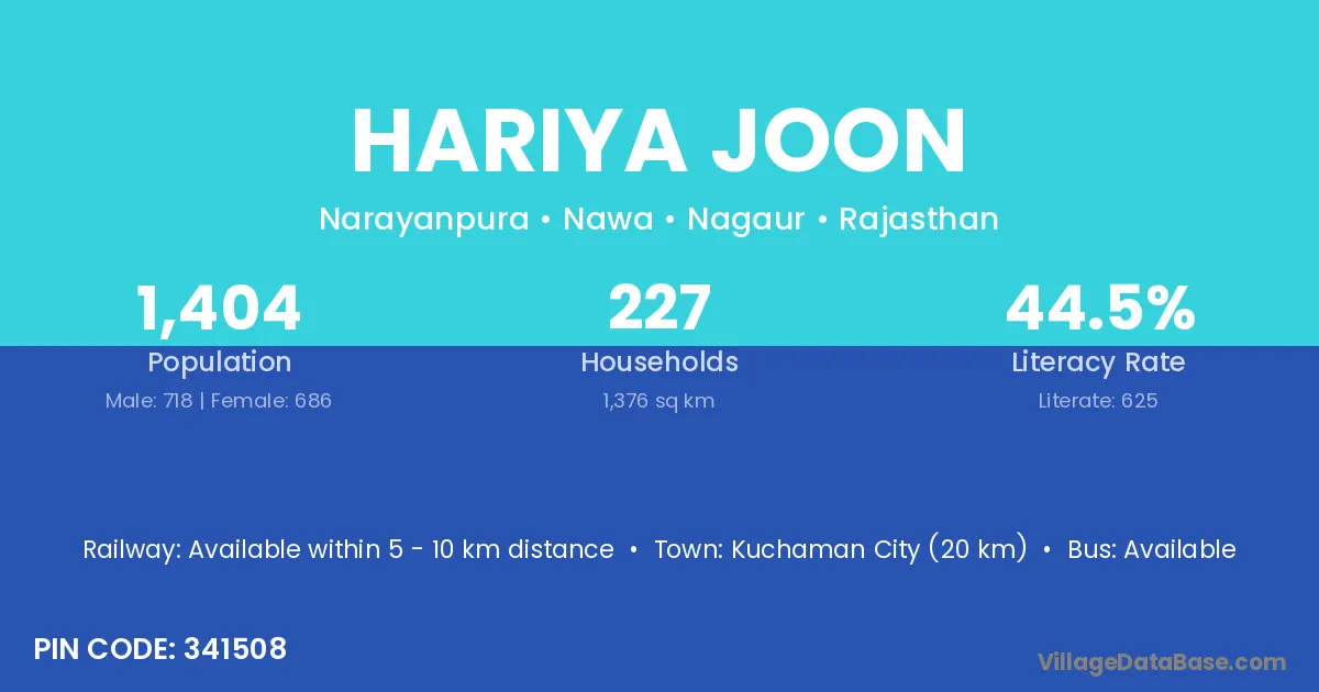 Kuchaman City (20 km) is the nearest town to Hariya Joon village for major economic activities and is located approximately 20 km away.