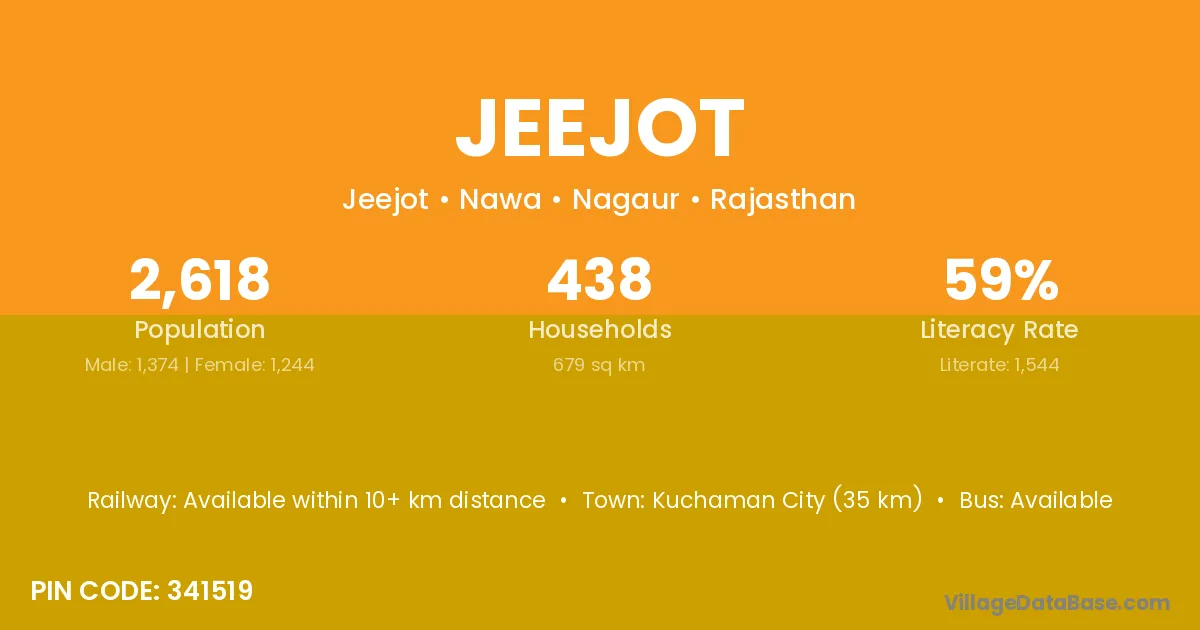 Kuchaman City (35 km) is the nearest town to Jeejot village for major economic activities and is located approximately 35 km away.