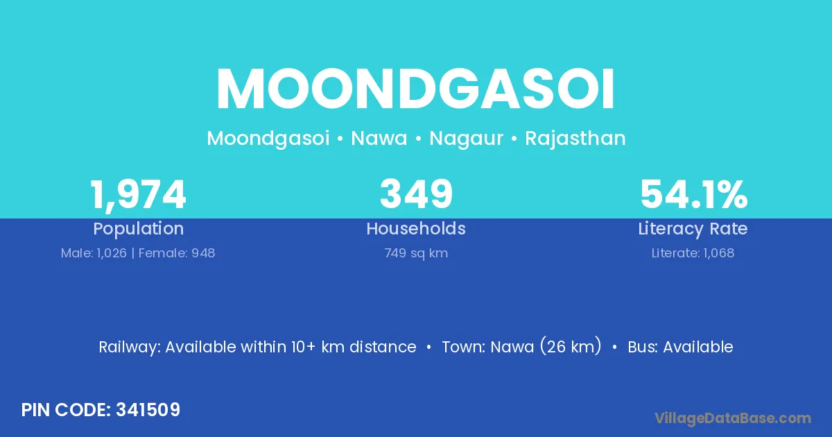 Nawa (26 km) is the nearest town to Moondgasoi village for major economic activities and is located approximately 26 km away.