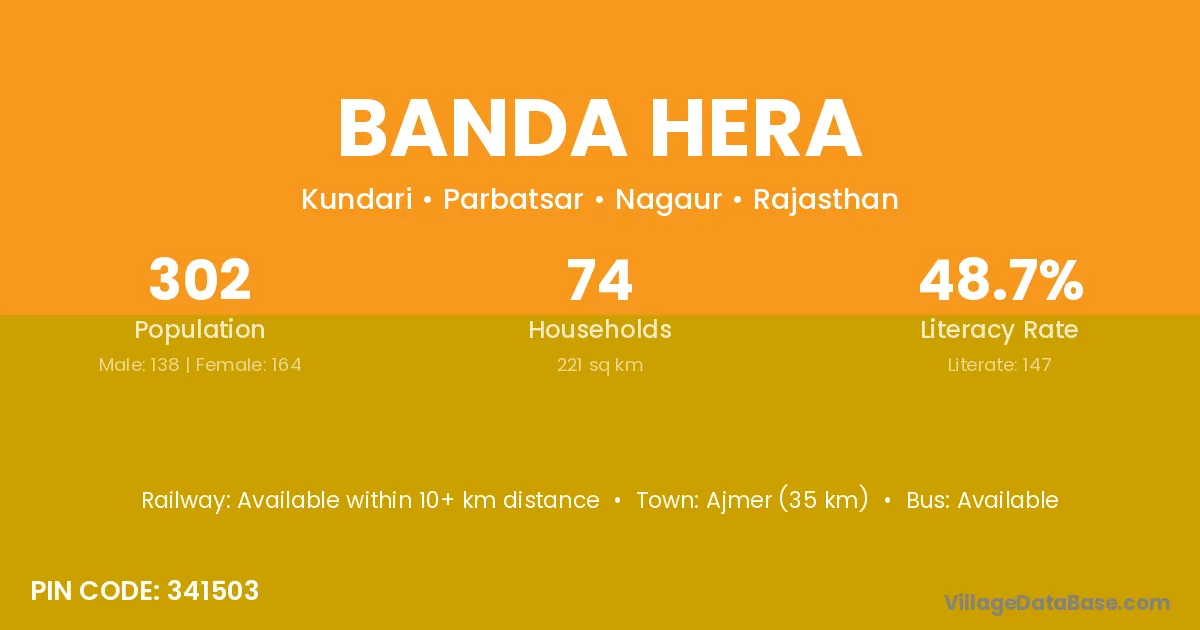 Ajmer (35 km) is the nearest town to Banda Hera village for major economic activities and is located approximately 35 km away.