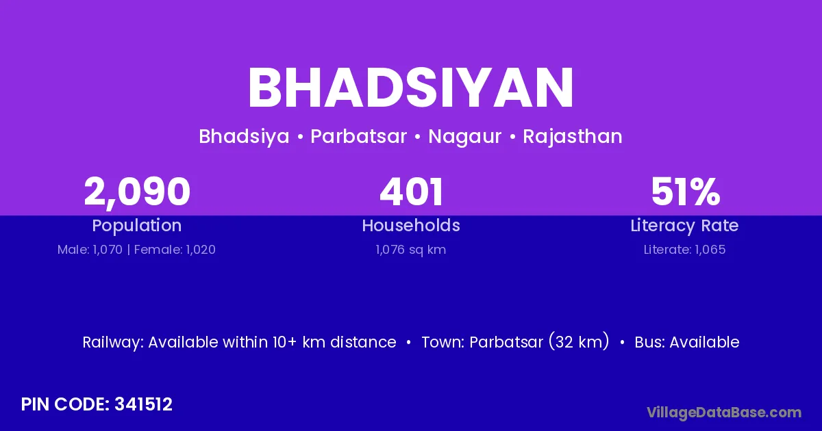 Parbatsar (32 km) is the nearest town to Bhadsiyan village for major economic activities and is located approximately 32 km away.
