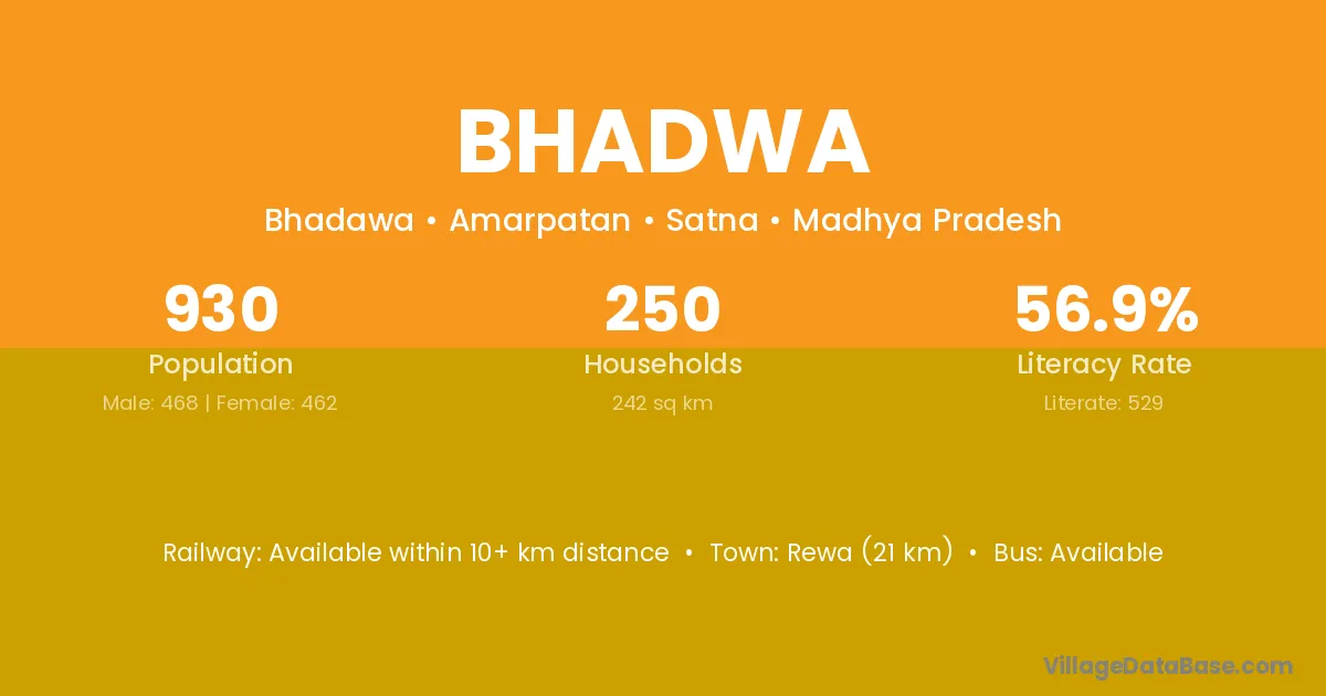 The literacy rate of Bhadwa village is 48.78%. Male literacy stands at 61.95% and female literacy at 35.49%.