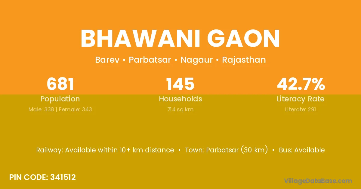 Parbatsar (30 km) is the nearest town to Bhawani Gaon village for major economic activities and is located approximately 30 km away.
