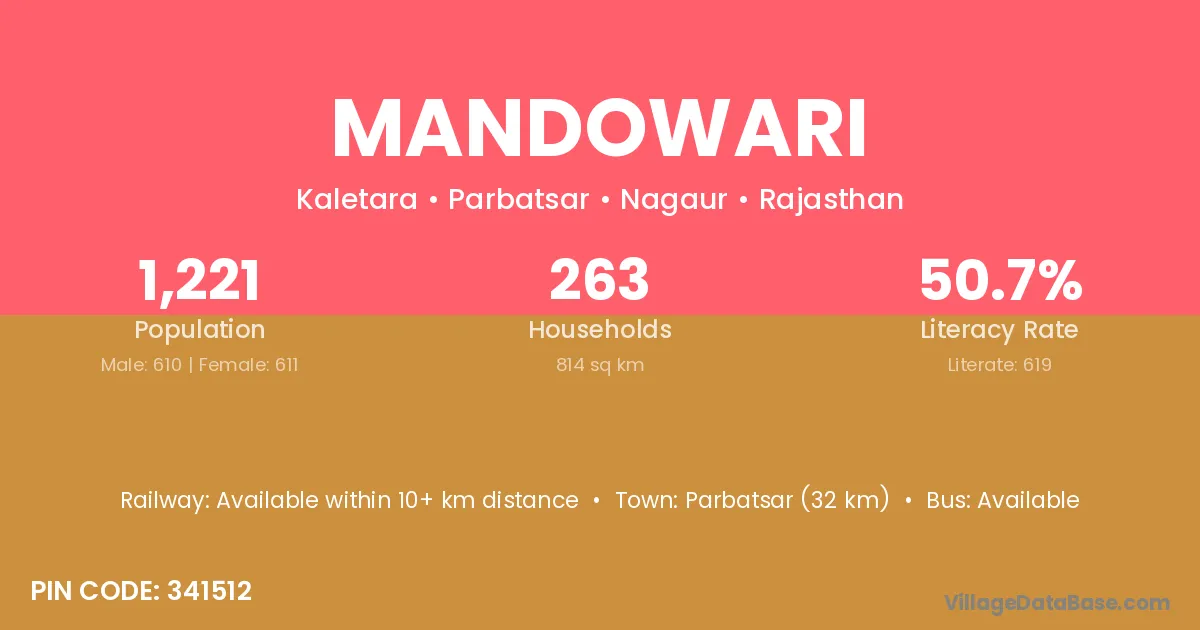 Parbatsar (32 km) is the nearest town to Mandowari village for major economic activities and is located approximately 32 km away.