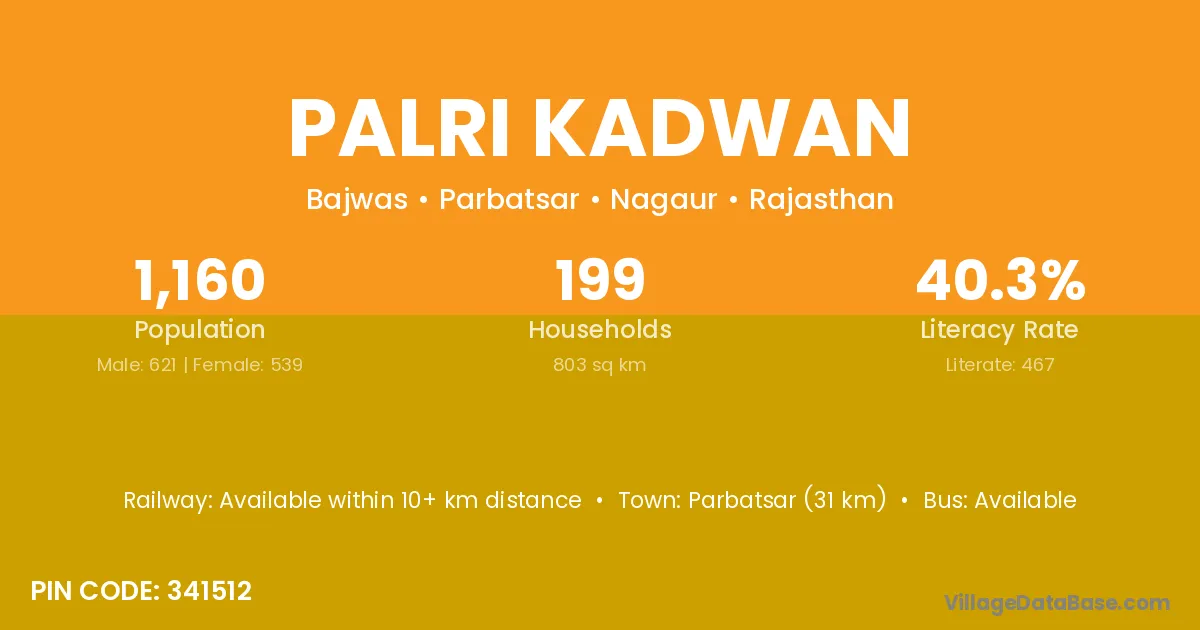Parbatsar (31 km) is the nearest town to Palri Kadwan village for major economic activities and is located approximately 31 km away.