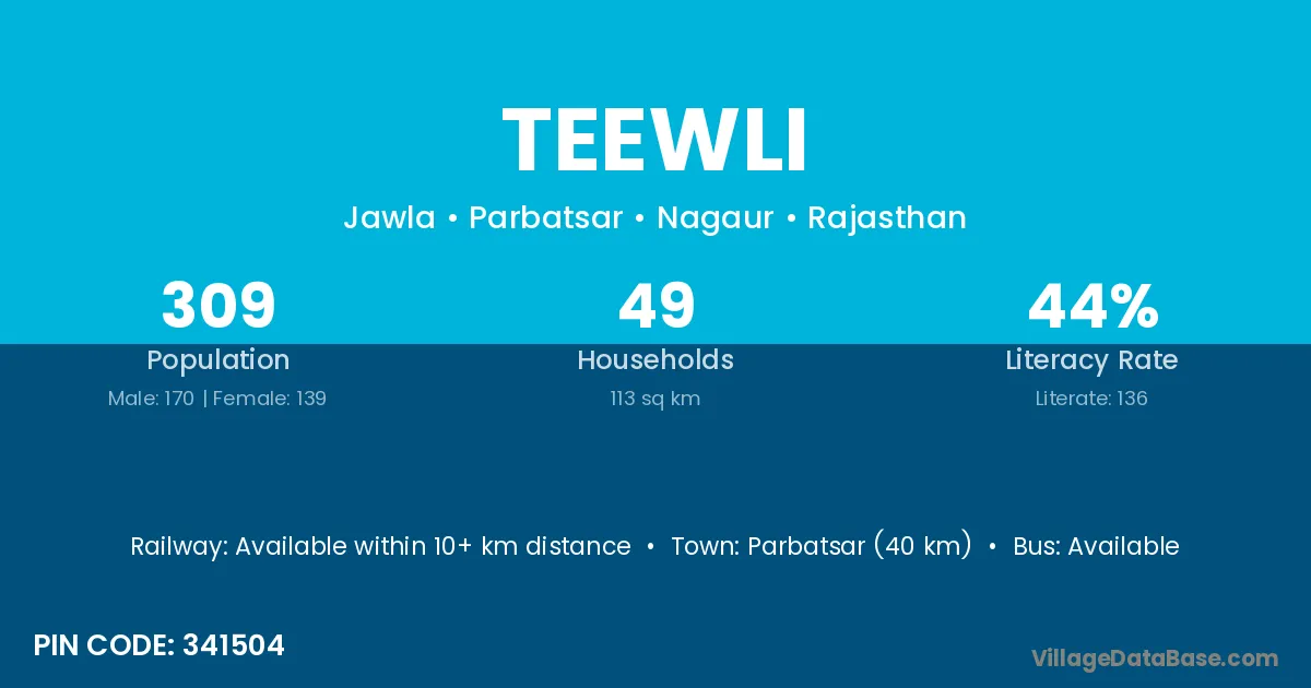 Parbatsar (40 km) is the nearest town to Teewli village for major economic activities and is located approximately 40 km away.