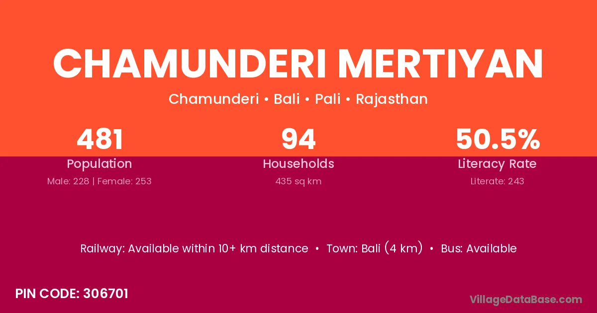 Chamunderi Mertiyan village has a total population of 481 people, of which 228 are males and 253 are females.