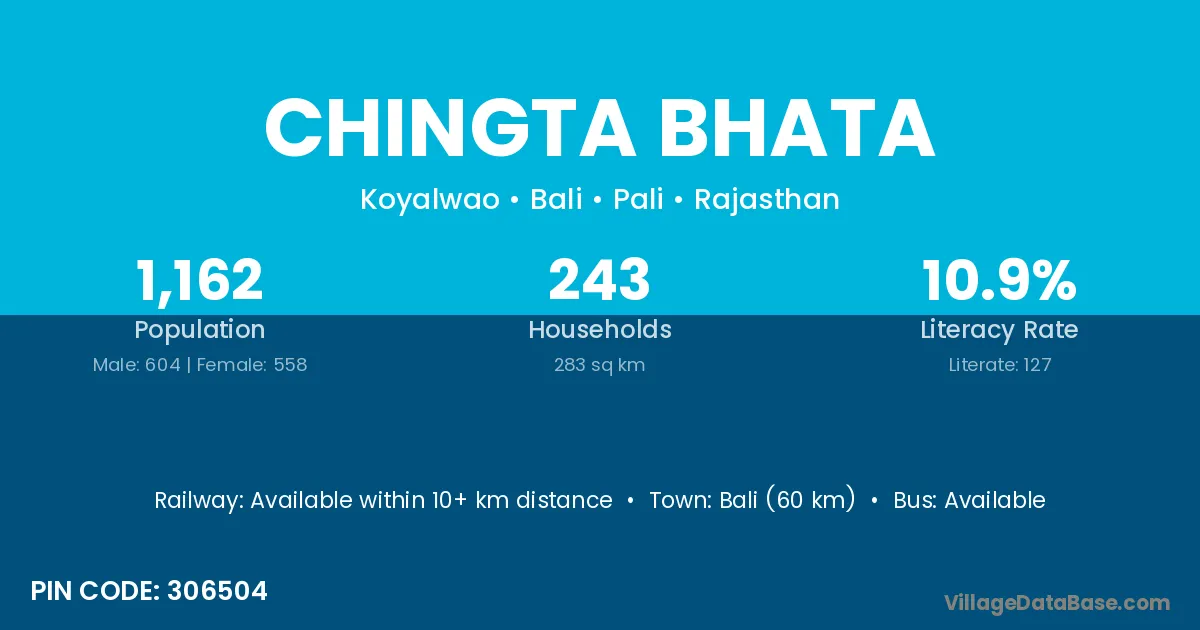 Bali (60 km) is the nearest town to Chingta Bhata village for major economic activities and is located approximately 60 km away.