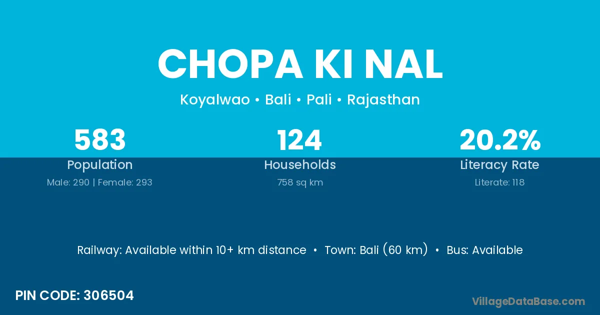 Chopa Ki Nal village has a total population of 583 people, of which 290 are males and 293 are females.