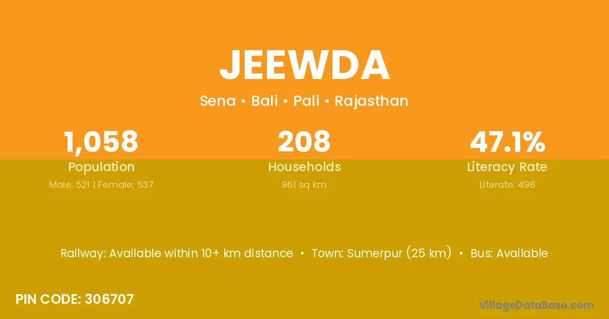 Sumerpur (25 km) is the nearest town to Jeewda village for major economic activities and is located approximately 25 km away.