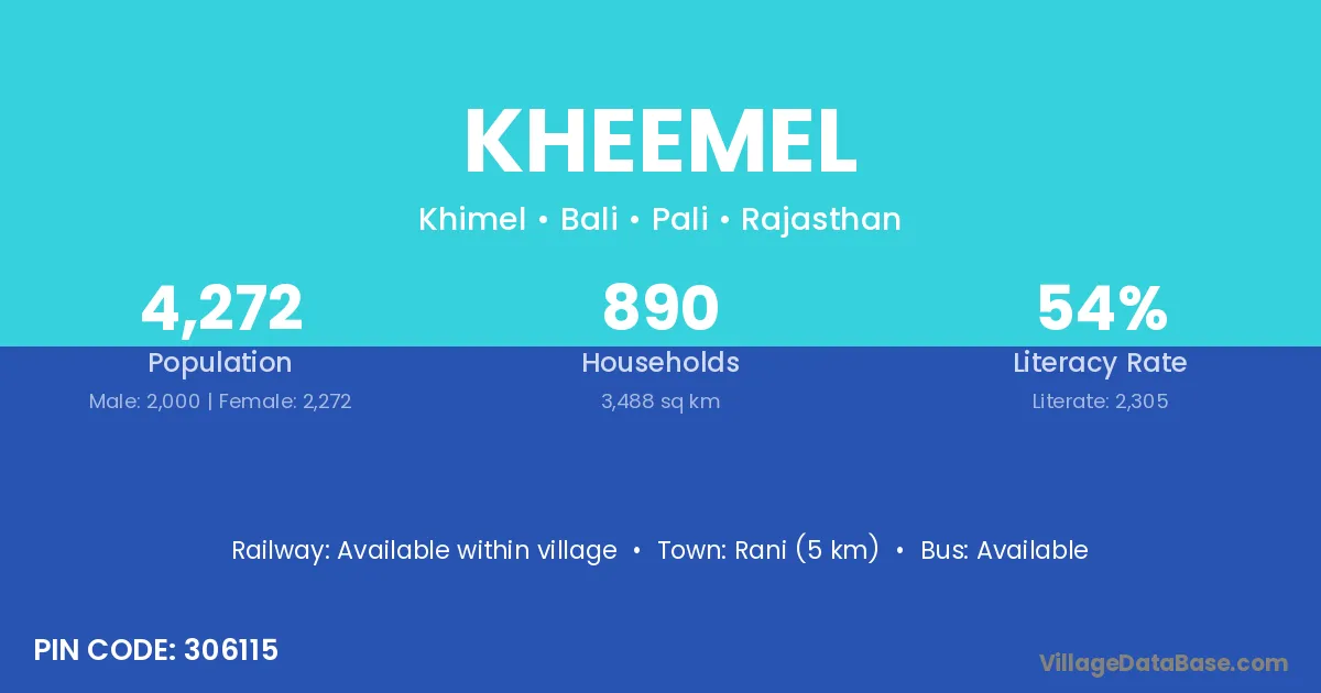 According to Census 2011 information, the village code of Kheemel village is 306115.