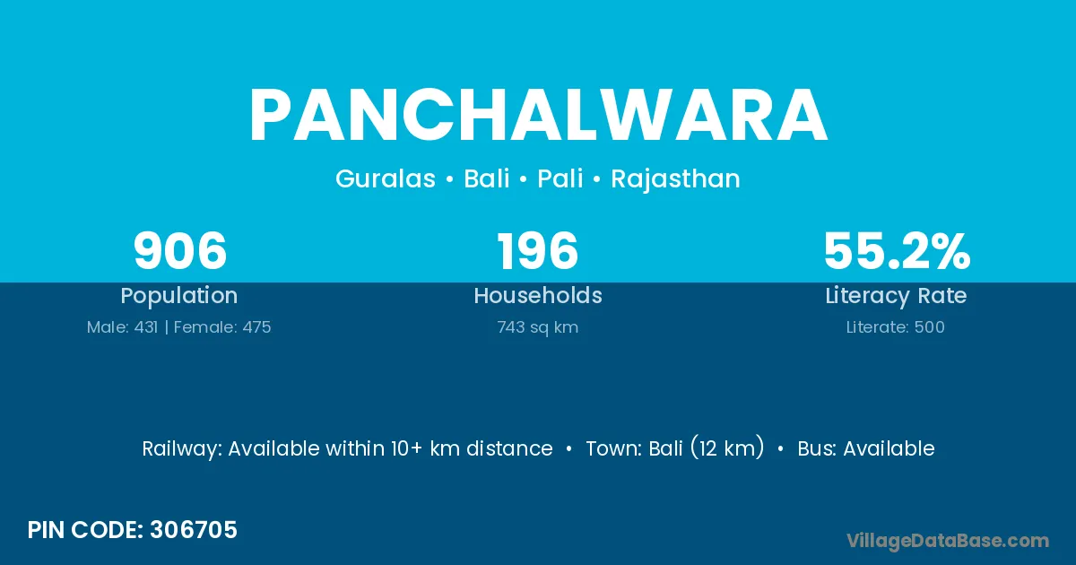 Bali (12 km) is the nearest town to Panchalwara village for major economic activities and is located approximately 12 km away.