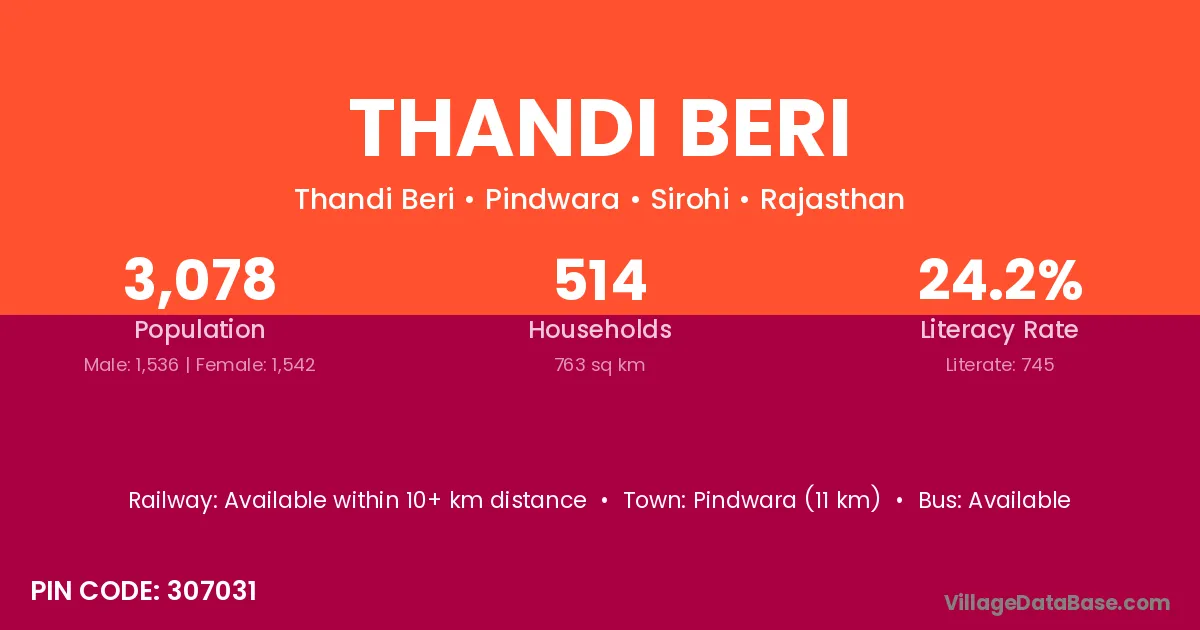 Bali (65 km) is the nearest town to Thandi Beri village for major economic activities and is located approximately 65 km away.
