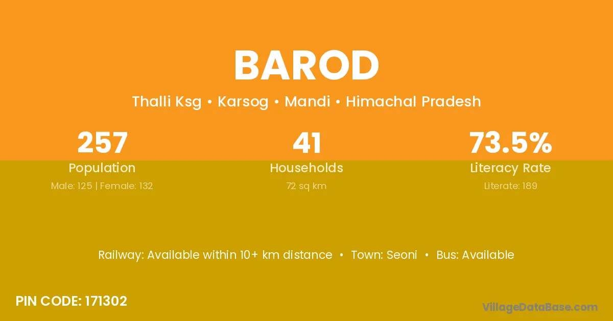 Rani (18 km) is the nearest town to Barod village for major economic activities and is located approximately 18 km away.