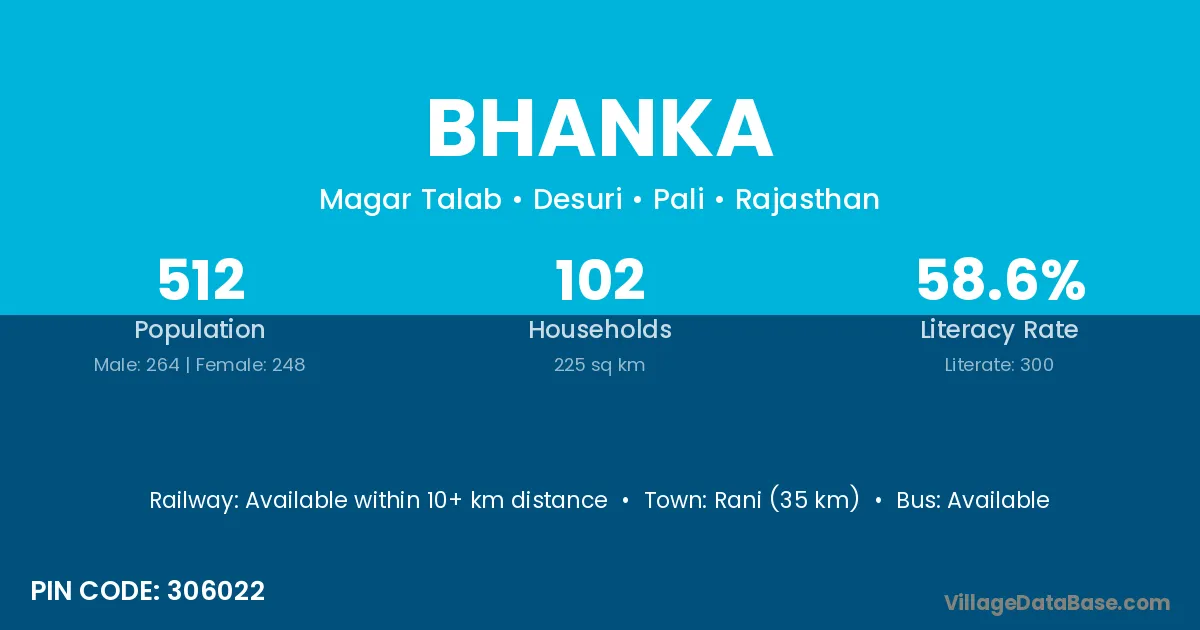 Rani (35 km) is the nearest town to Bhanka village for major economic activities and is located approximately 35 km away.