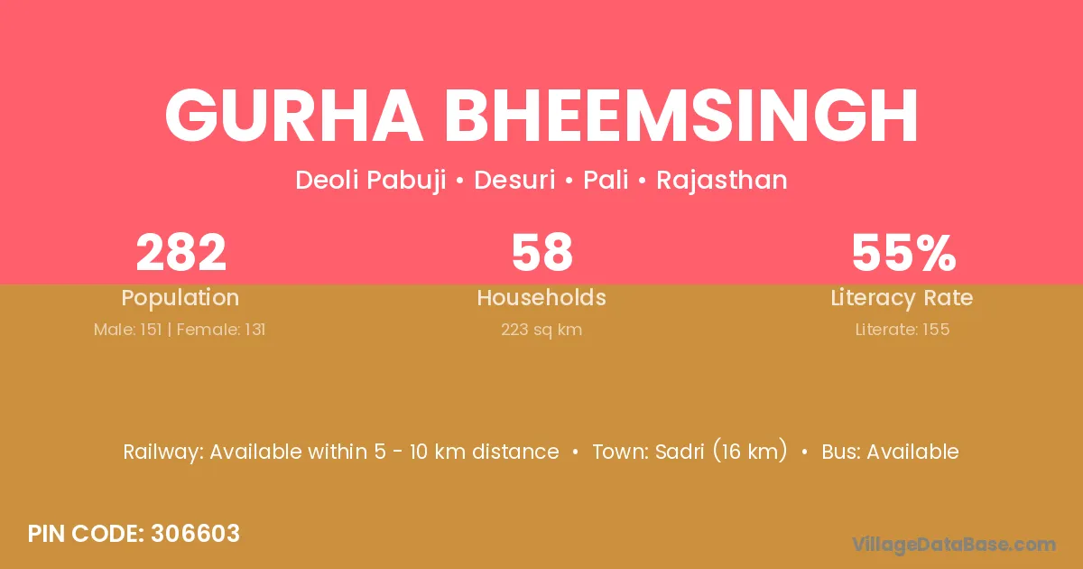 Sadri (16 km) is the nearest town to Gurha Bheemsingh village for major economic activities and is located approximately 16 km away.