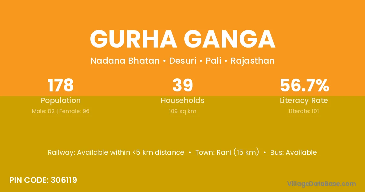 Rani (15 km) is the nearest town to Gurha Ganga village for major economic activities and is located approximately 15 km away.