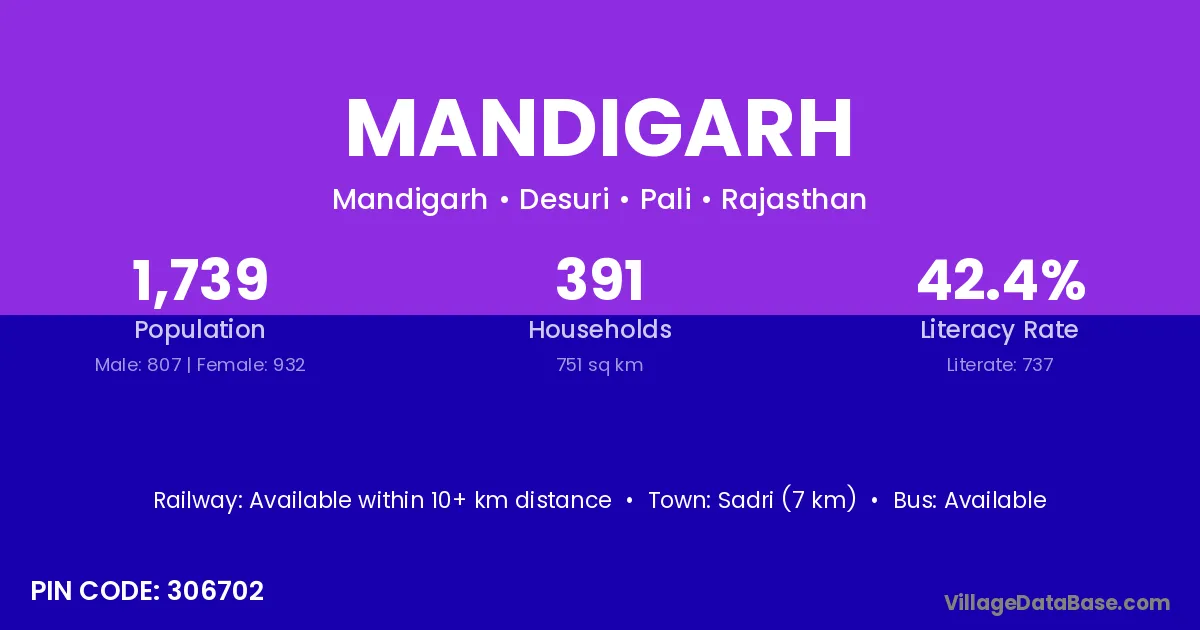Sadri (7 km) is the nearest town to Mandigarh village for major economic activities and is located approximately 7 km away.