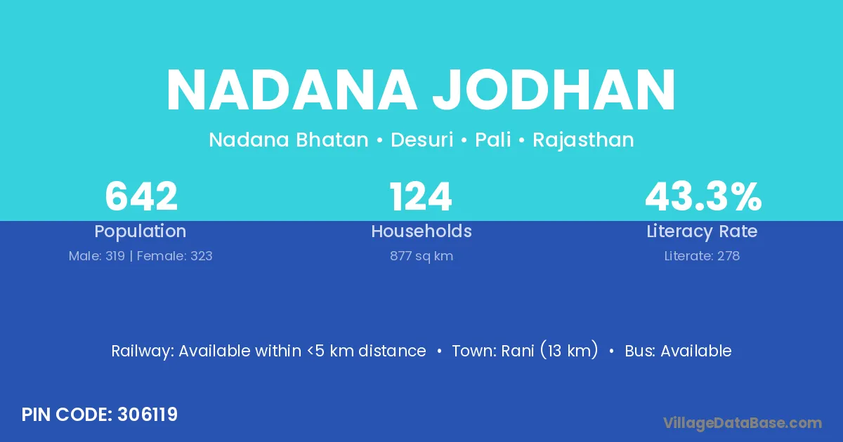 Rani (13 km) is the nearest town to Nadana Jodhan village for major economic activities and is located approximately 13 km away.