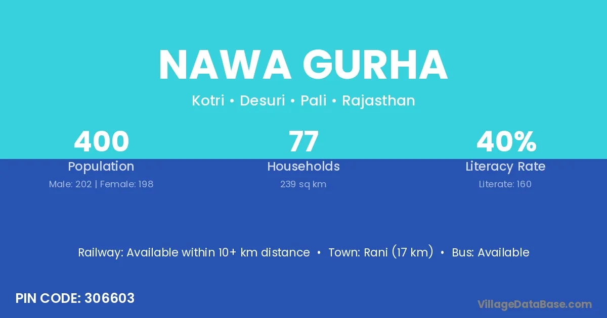 Rani (17 km) is the nearest town to Nawa Gurha village for major economic activities and is located approximately 17 km away.
