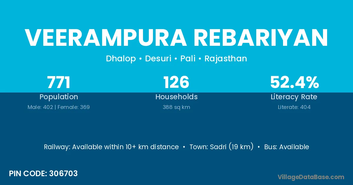 Sadri (19 km) is the nearest town to Veerampura Rebariyan village for major economic activities and is located approximately 19 km away.