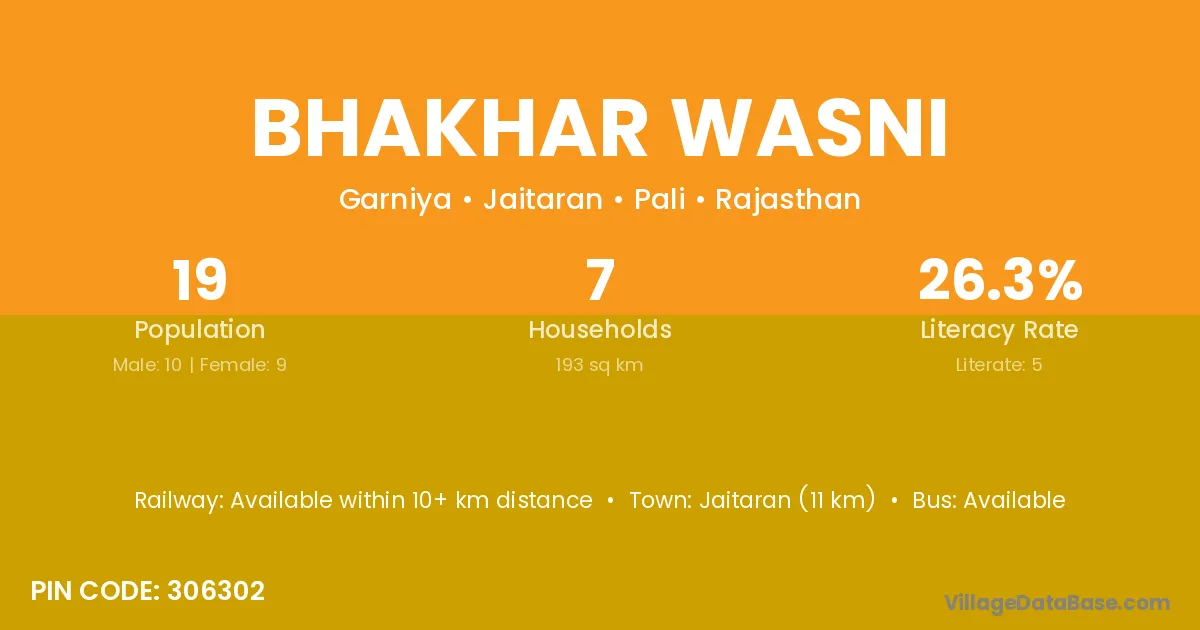 Jaitaran (11 km) is the nearest town to Bhakhar Wasni village for major economic activities and is located approximately 11 km away.