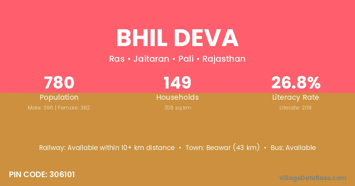Beawar (43 km) is the nearest town to Bhil Deva village for major economic activities and is located approximately 43 km away.