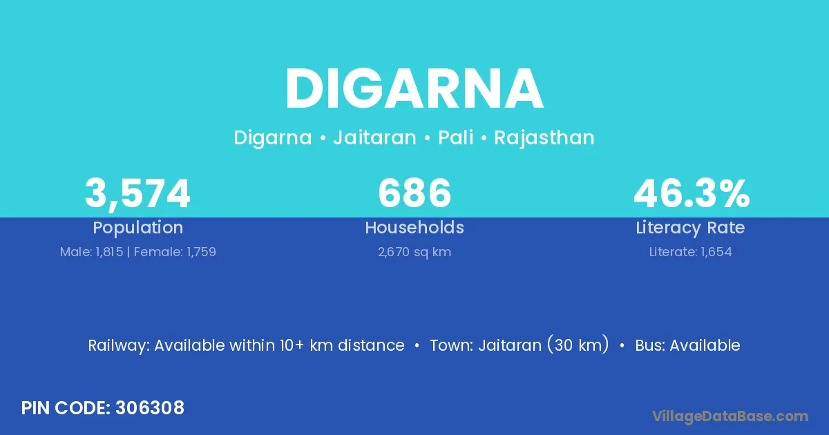 Jaitaran (30 km) is the nearest town to Digarna village for major economic activities and is located approximately 30 km away.