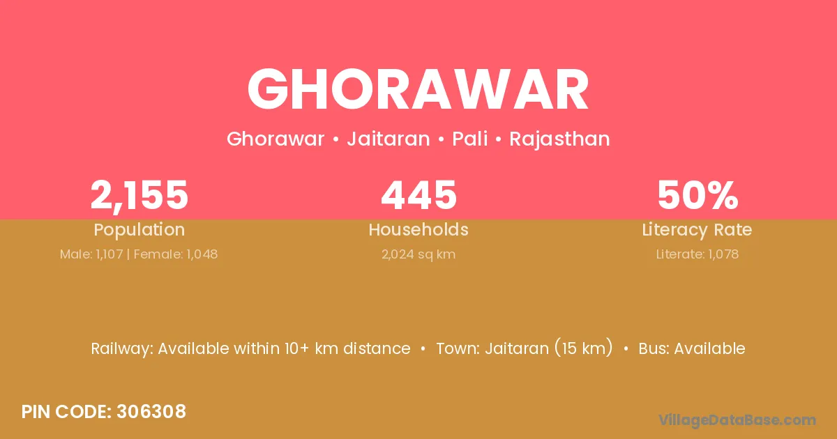 Jaitaran (15 km) is the nearest town to Ghorawar village for major economic activities and is located approximately 15 km away.