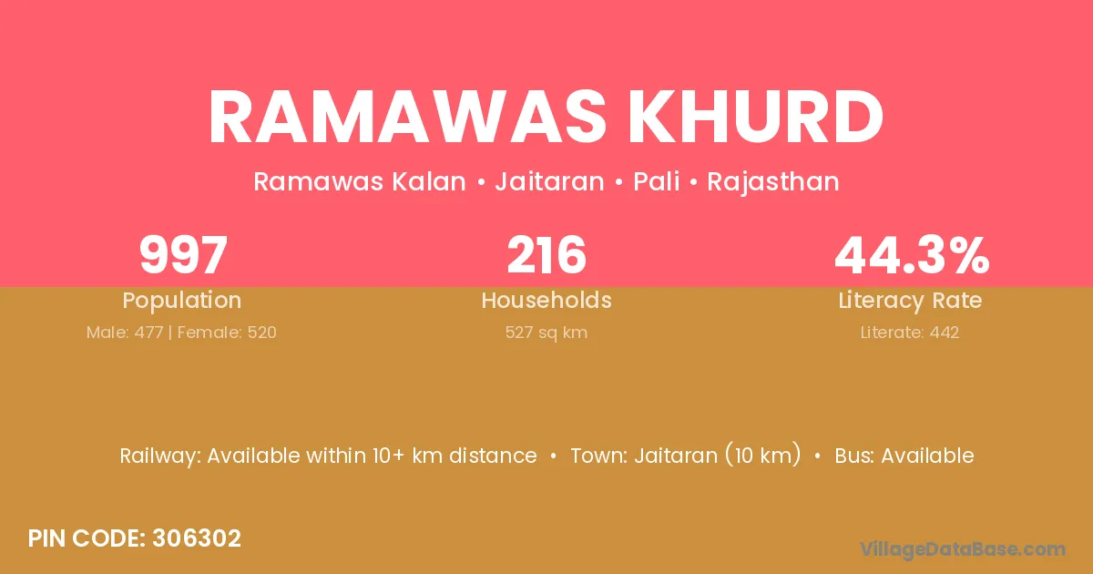 Ramawas Khurd village has a total population of 997 people, of which 477 are males and 520 are females.