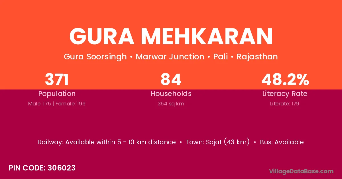 Sojat (43 km) is the nearest town to Gura Mehkaran village for major economic activities and is located approximately 43 km away.