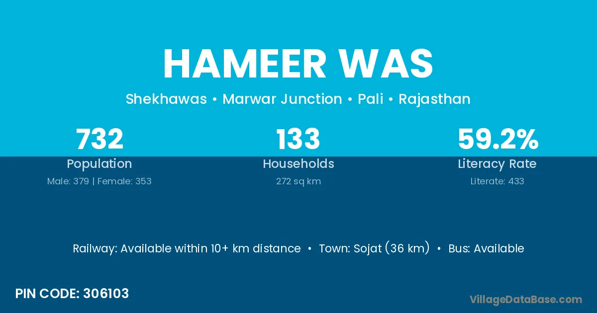 Sojat (36 km) is the nearest town to Hameer Was village for major economic activities and is located approximately 36 km away.