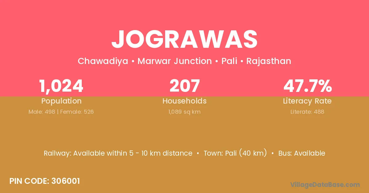 Pali (40 km) is the nearest town to Jograwas village for major economic activities and is located approximately 40 km away.