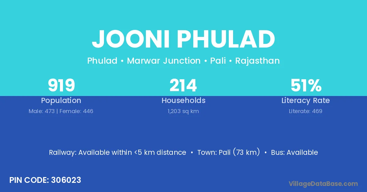 Pali (73 km) is the nearest town to Jooni Phulad village for major economic activities and is located approximately 73 km away.